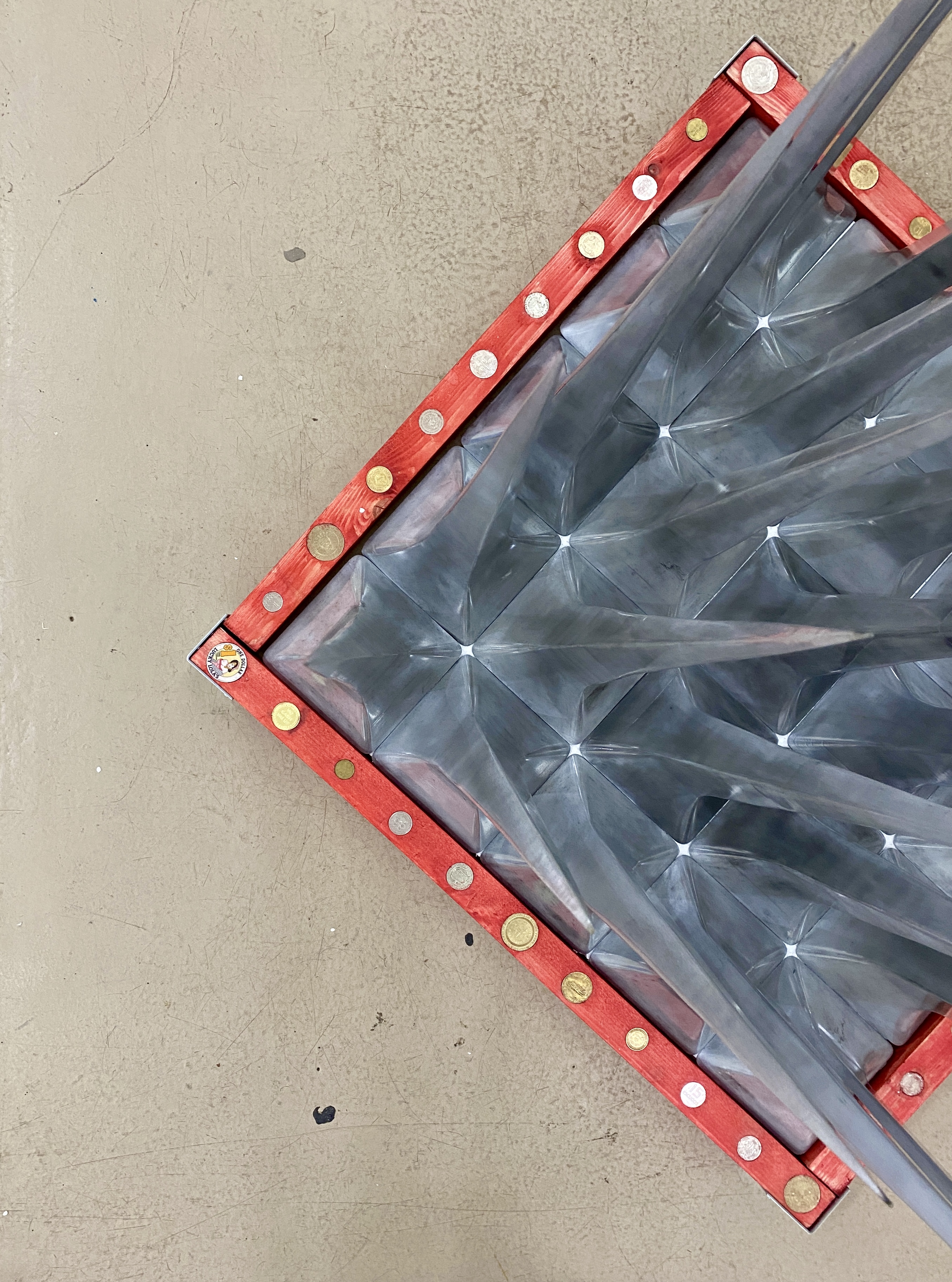 Stimualtion of pleasure through neural implants such as the Utah array and various other Micro Electrode Array’s (MEA). A more traditional version of stimulation is portrayed through early metallic casino tokens adorns the wooden base of which large metallic spikes protrude tying both forms of human interaction together through their material form.